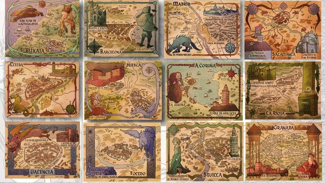Los mapas están diseñados y dibujados por Irina Hirondelle, tomando como referencia los siglos XVI y XVII. En ellos se destaca un monumento o lugar clave de una ciudad o pueblo de la provincia, así como una criatura, personaje o monstruo tradicional proveniente del folclore de la zona.