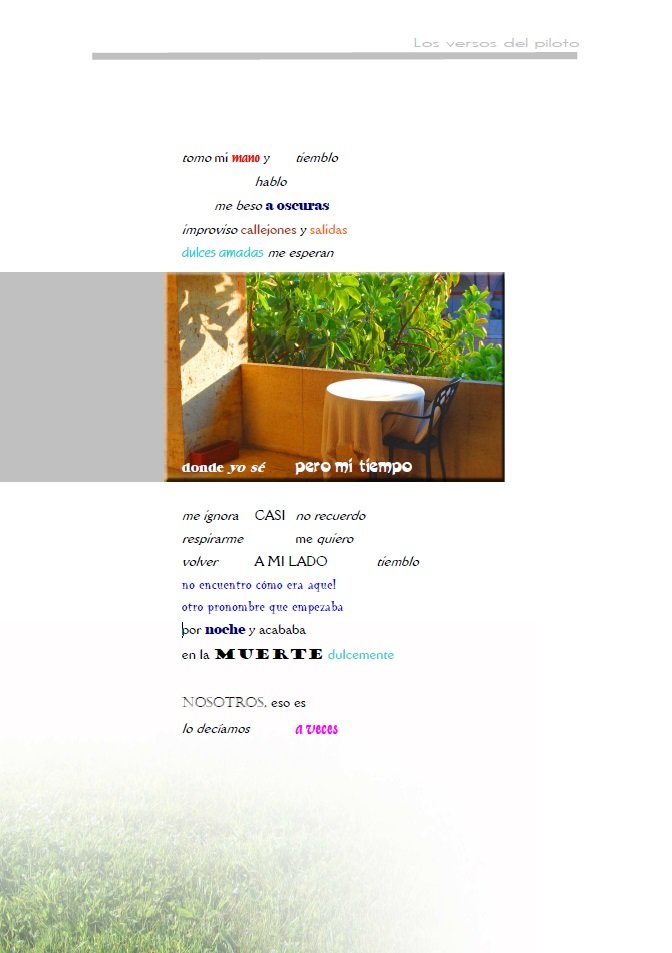 "Los Versos del Piloto" es una colección de versos experimentales escritos entre 1980 y 1995. Su inspiración es minimalista, sustantiva, telegramática.