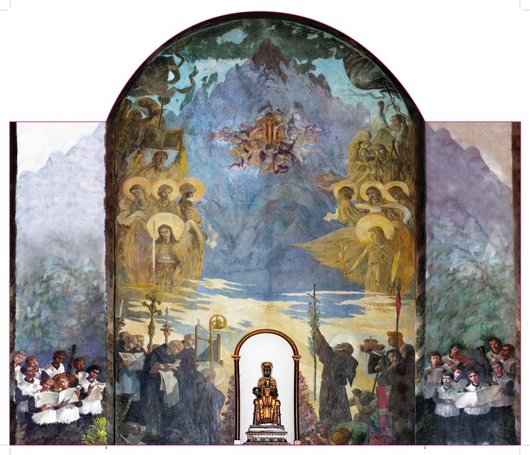 Reproducció a mode de tríptic de les pintures modernistes de la capella de Montserrat a l’església de St. Vicenç realitzada per Adrià Gual i Lluís Pallarés.