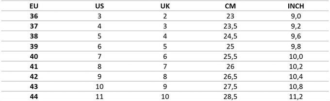 Aqui les dejamos las tallas unisex que van del 37 al 44 en nuestras producción.
