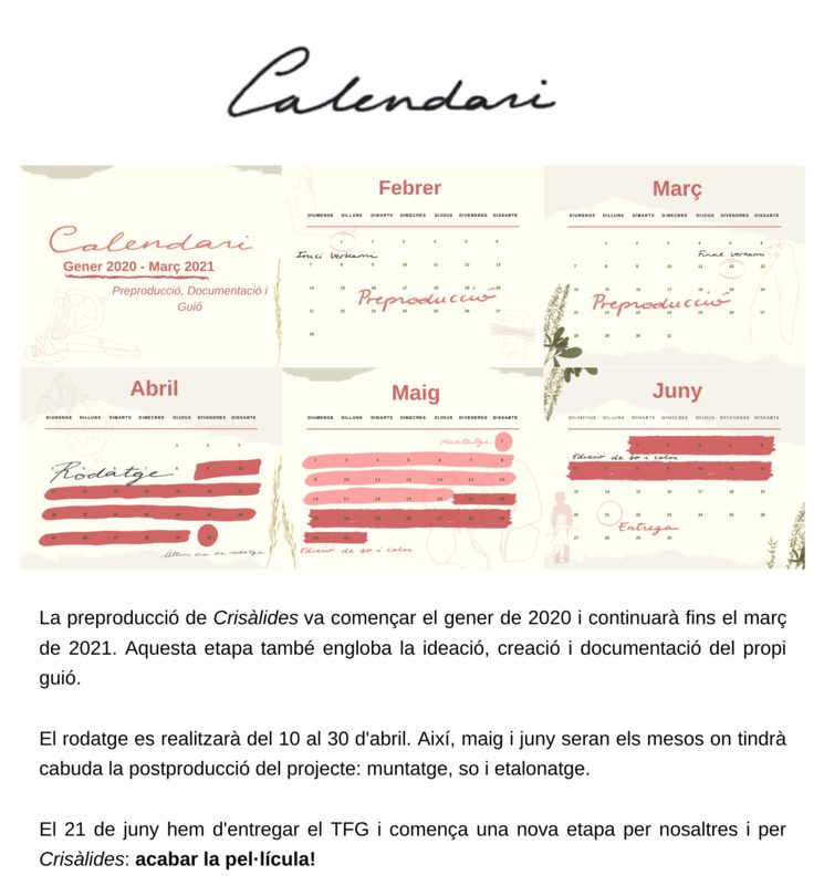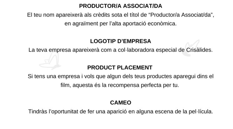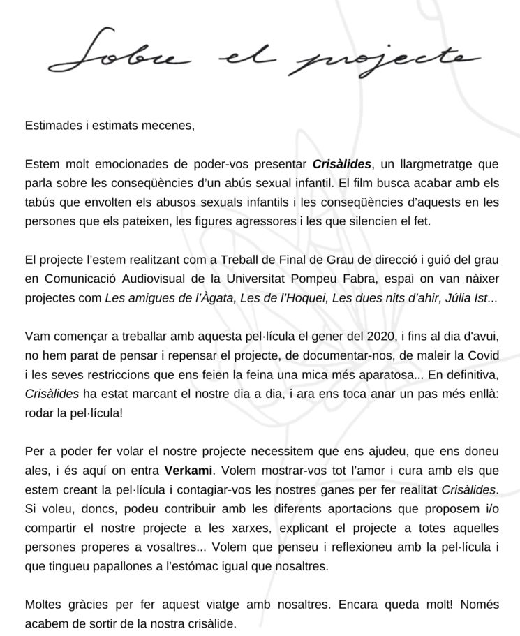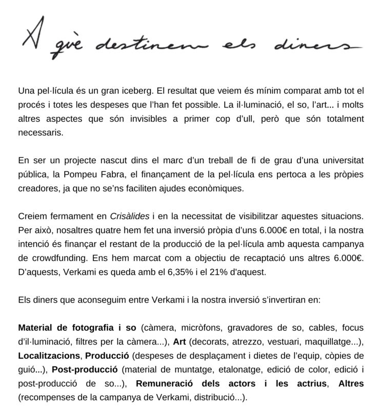 Segueix-nos a l’Instagram, @crisalides, i/o al Twitter, @ crisalidesfilm, per anar veient de prop com evoluciona el projecte. També pots contactar amb nosaltres enviant-nos un correu a [email protected], per qualsevol cosa!