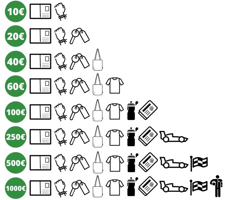 Team postcard with personalized thank you + e-Tech Racing fabric wristband + e-Tech Racing key chain + Tote Bag ETR (Design to choose) + e-Tech Racing shirt (Design to choose) + Canteen ETR + Name (or logo) in our newsletter + Name (or logo) on the inside of the rear wing + See the car run in one of our tests + Ride and race the car on a closed circuit