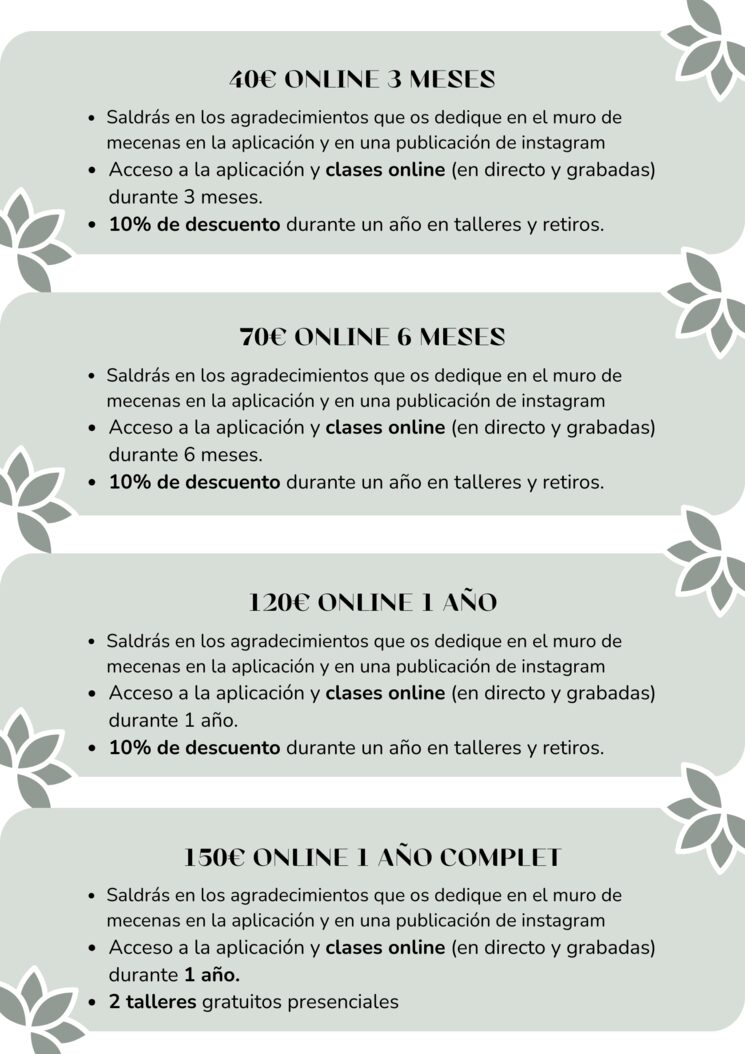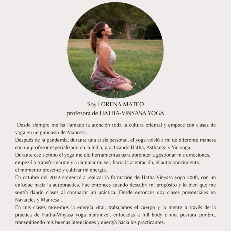 Los talleres son presenciales o online, podréis visualizar las fechas disponibles por mi aplicación ( que os daré el enlace junto con la mecena) o bien por intagram @lorenamateoyoga.