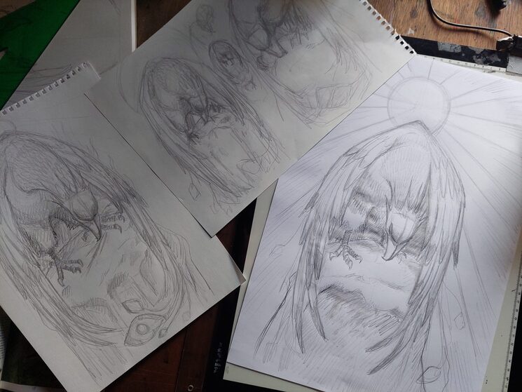 🦅 En la imagen podéis ver los bocetos del águila, una de las criaturas simbólicas del bestiario, que representa la visión, la sabiduría y la trascendencia.