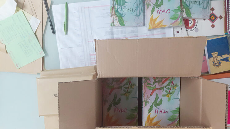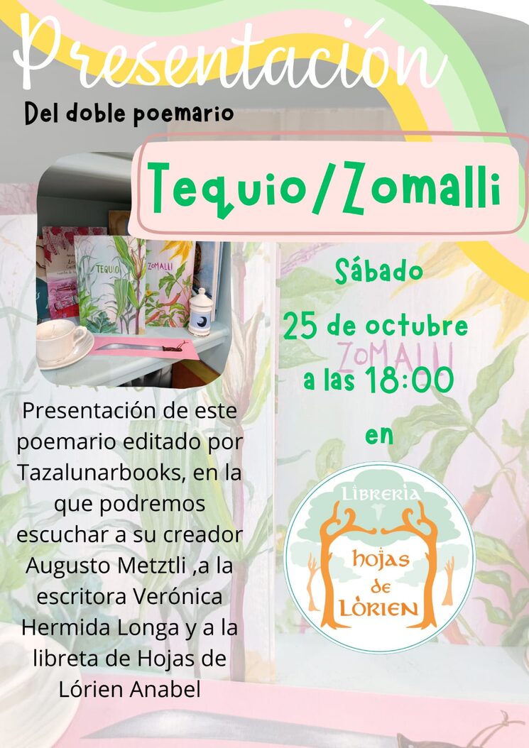 El libro en realidad son dos libros, dos antologías poéticas e ilustradas de diversas autoras. Uno se llamará “Tequio” y contendrá todo lo relacionado a ese tema, acabará en la mitad del paginado. Para leer el otro libro, se empezaría por lo que sería la "contraportada", dando la vuelta al libro y girándolo, ese lado se titulará “Zomalli”, y terminará igualmente a mitad del paginado del total del libro.