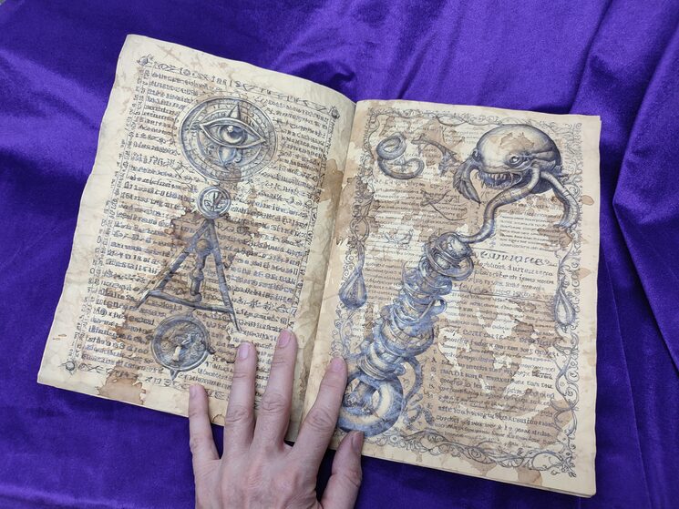 Cada Necronomicon es único. Con un tamaño de A4, compuesto por 36 páginas el original. Cada página es tratada con 5 capas de envejecimiento, una locura, ya que son varios días el hacer una sola página.