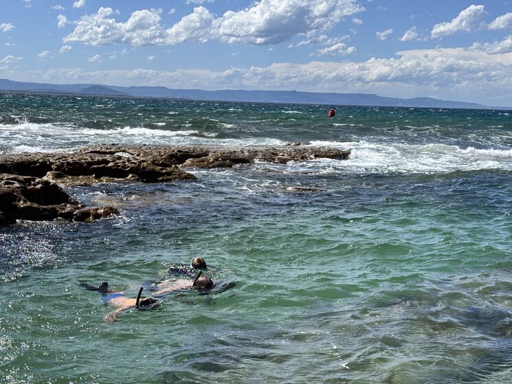 Estos días están siendo una mezcla de naturaleza, deporte y vida sencilla junto al mar. Hemos disfrutado del snorkel, del kayak, hemos probado el free diving, y en uno de los momentos más memorables, Lidia y yo nadamos más de un kilómetro para ir desde Kalymnos hasta Telendos. También hemos tenido tiempo para la escalada, y yo incluso he trabajado algunos días como guía de escalada, lo que siempre ayuda a sumar un ingreso extra durante el viaje.