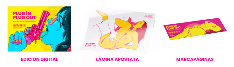 Una vez adquieras tu pack, tendrás la posibilidad de añadir la versión digital de Plug In Plug Out. Relatos eróticos ilustrados, la lámina A5 Apóstata o hacerte con más marcapáginas.