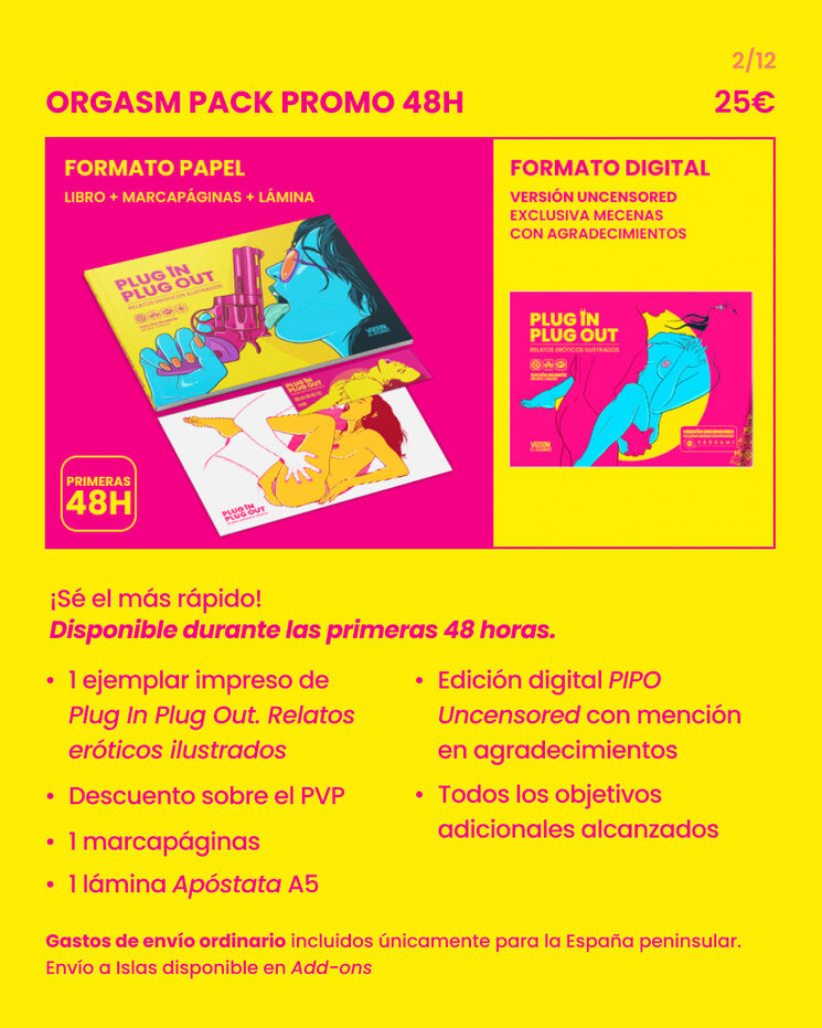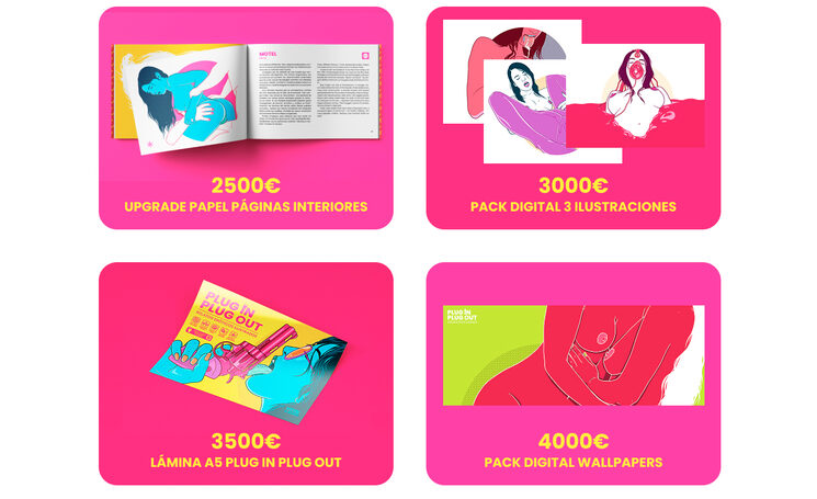 • Si se alcanzan 2500€: la edición impresa de Plug In Plug Out. Relatos eróticos ilustrados obtendrá un upgrade y sus páginas serán de 150g/m2 (actualmente 135g/m2)