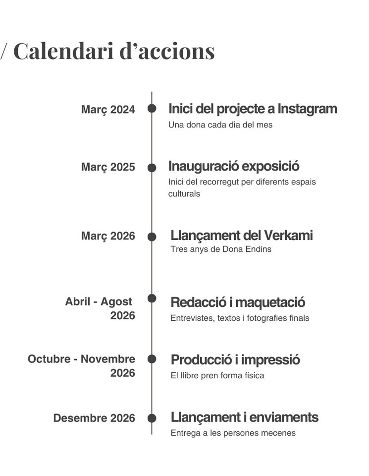 Aquest llibre no neix d'un dia per l'altre. És el resultat d'un procés llarg, viscut amb calma i molta intenció. Des del març del 2024 fins avui, Dona Endins ha anat creixent pas a pas, amb escolta, dedicació i moltes converses. Aquest calendari recull els moments clau que han fet possible el projecte i tot el que encara ha de venir.