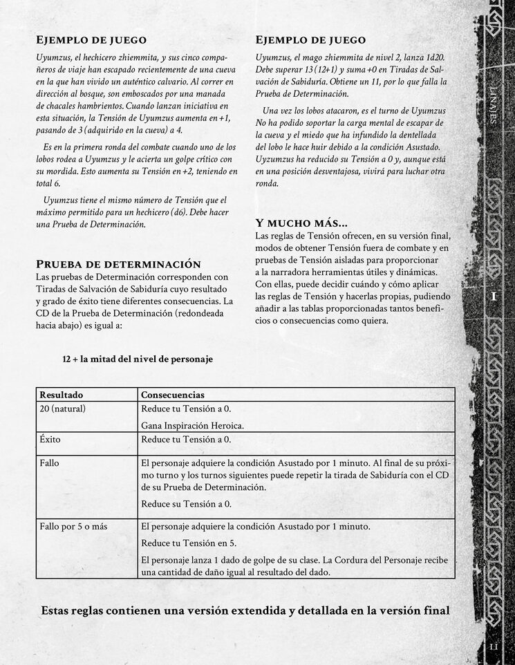 Tensión. Cada frustración y traspié aumenta las posibilidades de que tu determinación sea puesta a prueba. Aprende a regular la tensión de tu personaje o corre el riesgo de perder el control en el momento menos oportuno.