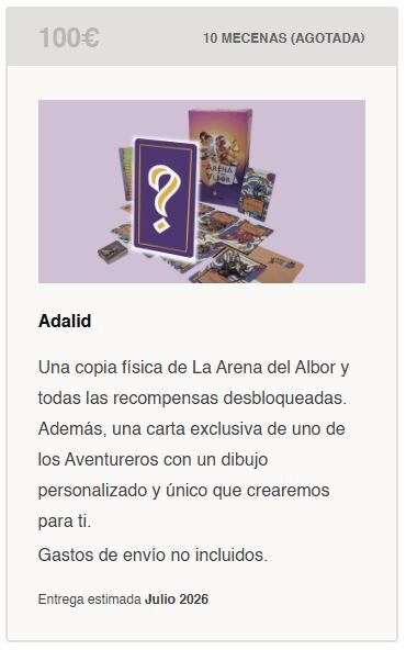 Adalid (100€): para aquellas personas que verdaderamente desean apoyar al proyecto. Una copia en físico de La Arena del Albor así como una copia en digital para descargar en itch.io. Además, recibirás una carta única y personalizada de uno de los Aventureros dibujado por Clara, nuestra artista. Puede ser uno de tus personajes de rol, u otro personaje que desees.