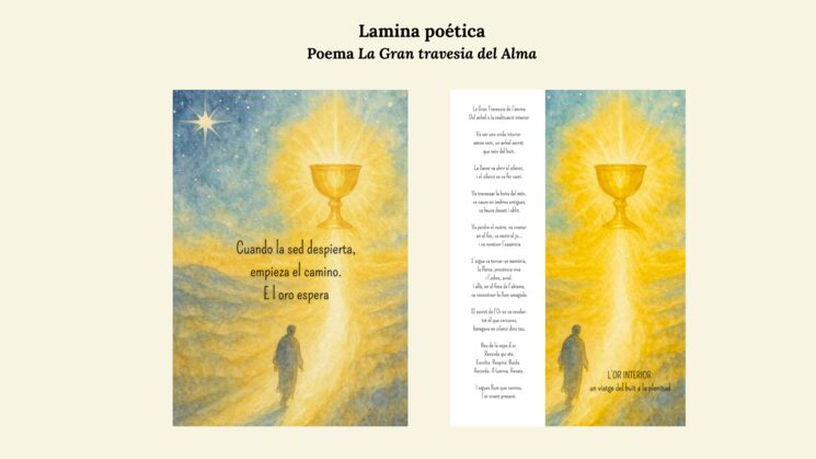 2) Lámina poética: Lámina A5 con ilustración y un poema inédito escrito por el autor, que resume simbólicamente el viaje a El Oro Interior.