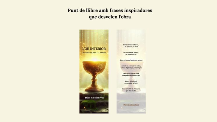 1) Punt de llibre inspirador: Punt de llibre exclusiu inspirat en L’Or Interior, amb il·lustració pròpia i frases inspiradores pròpies de l’autor, que condensen l’essència de l’obra.