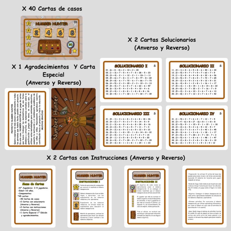 Baraja: 50 cartas Especial Naipe Estucado 350g de 63 x 88 mm (X1 Carta especial, X2 Cartas con Instrucciones, X2 Cartas con solucionario y 40 Cartas de caso de números desaparecidos.