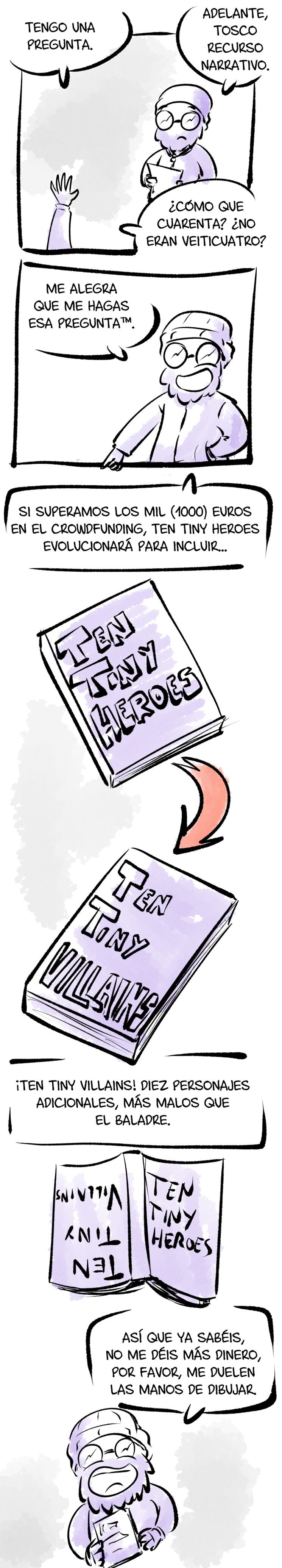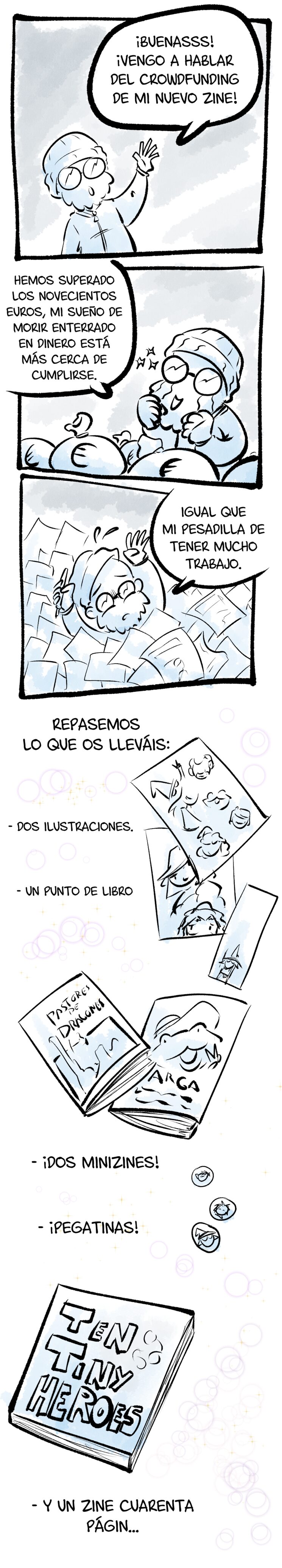 Llevo más de media vida haciendo garabatos en Internet y en diversos fanzines, pero Ten Tiny Heroes es mi primer proyecto en papel desde que publiqué Apocalipsis Accidental en 2016. Es un zine que nace de la ilusión y la necesidad de crear, de agarrar los lápices y ponerse a dibujar algo nuevo para enseñárselo al mundo. Y, con vuestro apoyo, podré conseguirlo.