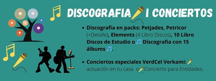 También podéis llevaros toda o gran parte de nuestra música con vosotros. Petjades (VerdCel canta Raimon), Petricor (+ Postal & Perfume), Elements (Els dies del Saurí + Argilaga + De plantes, talaies i cims + Bifocal: Ras i Pols), los 10 Libros- Discos de Estudio o toda la 🎵 Discografía con 15 álbumes 🎵.
