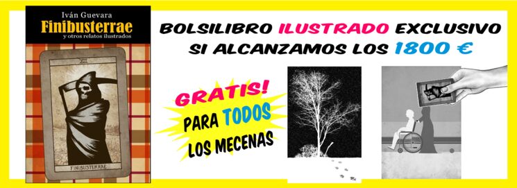 Si conseguimos alcanzar este nuevo objetivo, TODOS los mecenas —todos, los nuevos y también los que hayan participado desde el primer momento— recibirán completamente gratis un bolsilibro ilustrado por Txiki González conteniendo 5 relatos de Iván Guevara; tres de ellos aún inéditos y los otros dos, editados hace más de 10 en una publicación agotada. Los títulos de los relatos que componen el libro-obsequio son: Ángeles de azúcar, Te vas a reír, Horario de visitas, ¿Quién tiene la respuesta? y Finibusterrae.