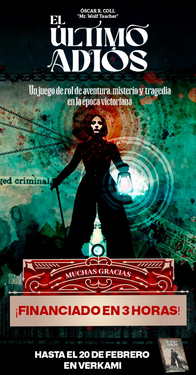 Tras un largo periodo de desarrollo y ensayo, la creación de Mr. Wolf está lista para que finalmente podáis disfrutarla. El último adiós cobra vida como un manual de juego de alrededor de 300 páginas, impresas a color, en formato 17x24cm, tapa blanda con solapas y evocativamente ilustrado. Gracias a este mecenazgo lo podrás conseguir en formato físico y digital, a la vez que colaboraras en convertir el juego en algo memorable.
