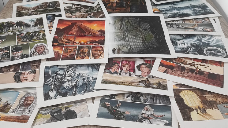 Página doble original del cómic (A3 a escoger) 450eur. Llévate a casa una parte tangible del proyecto con una página doble original a color, pintada a mano con acuarela y acrílico. Accede a https://laordendelequilibrio.com/originales para ver los originales disponibles.