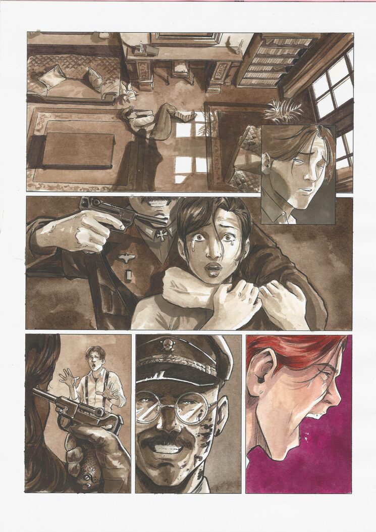 Página original del cómic (A4 a escoger) 250eur. Llévate a casa una parte tangible del proyecto con una página original a color, pintada a mano con acuarela y acrílico. Accede a https://laordendelequilibrio.com/originales para ver los originales disponibles.