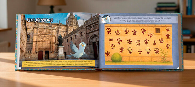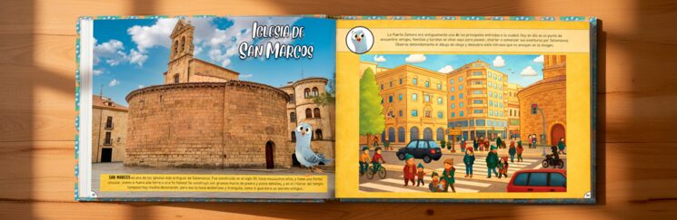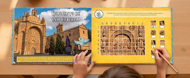 Queríamos un libro con fotografías reales que no solo se leyera, sino que también invitara a dibujar, jugar e interactuar. Así, a través de pasatiempos inspirados en los monumentos más conocidos de Salamanca buscamos que los niños y sus familias disfruten juntos mientras descubren datos, curiosidades y leyendas sobre la ciudad.