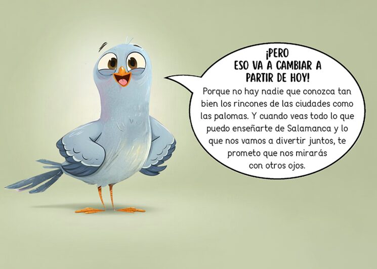 Pues no es la famosa rana ni el conocido astronauta sino una simpática paloma, que nos guiará por las calles y monumentos más conocidos de Salamanca.