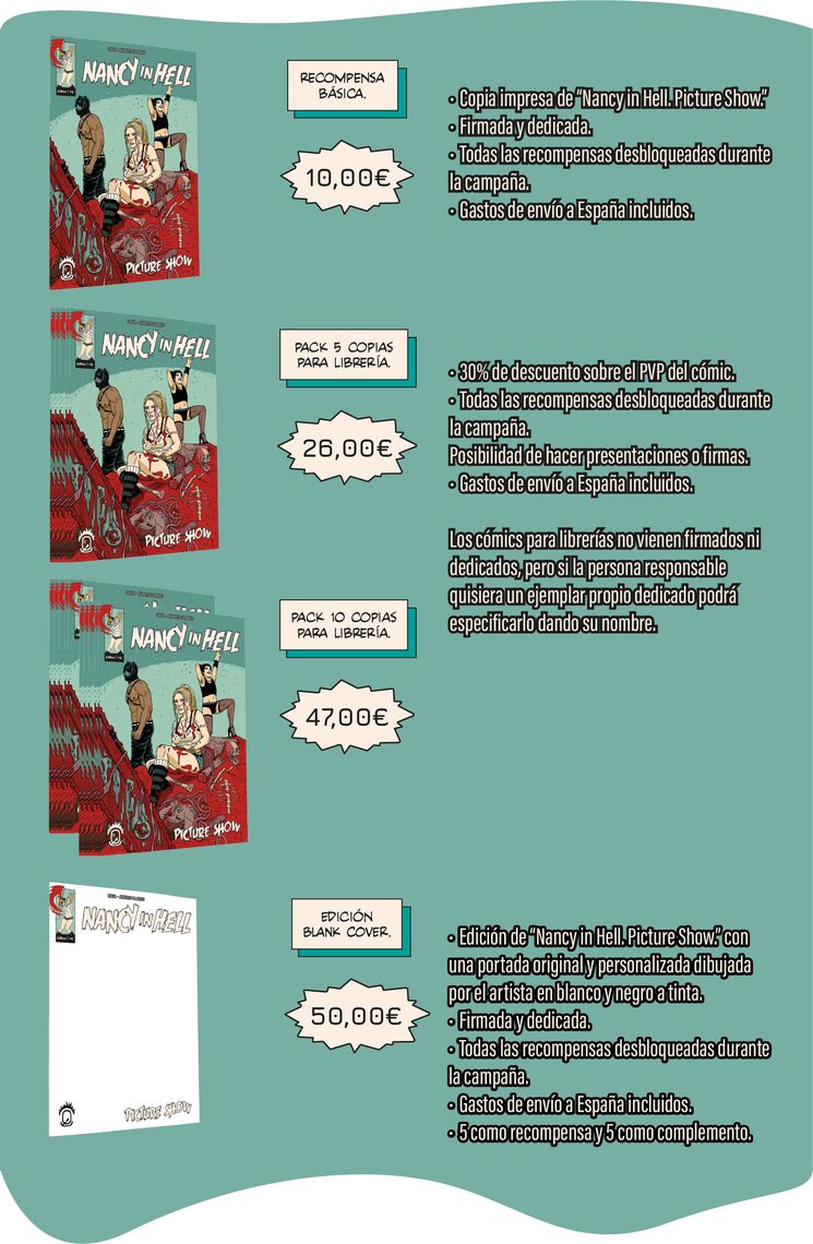 Por 10€ recibirás una copia de la primera edición del cómic firmada, con los gastos de envío incluidos a toda la Península y Baleares y todas las recompensas desbloqueadas durante la campaña. Todos los packs del cómic tienen opción a añadir un dibujo como add-on.