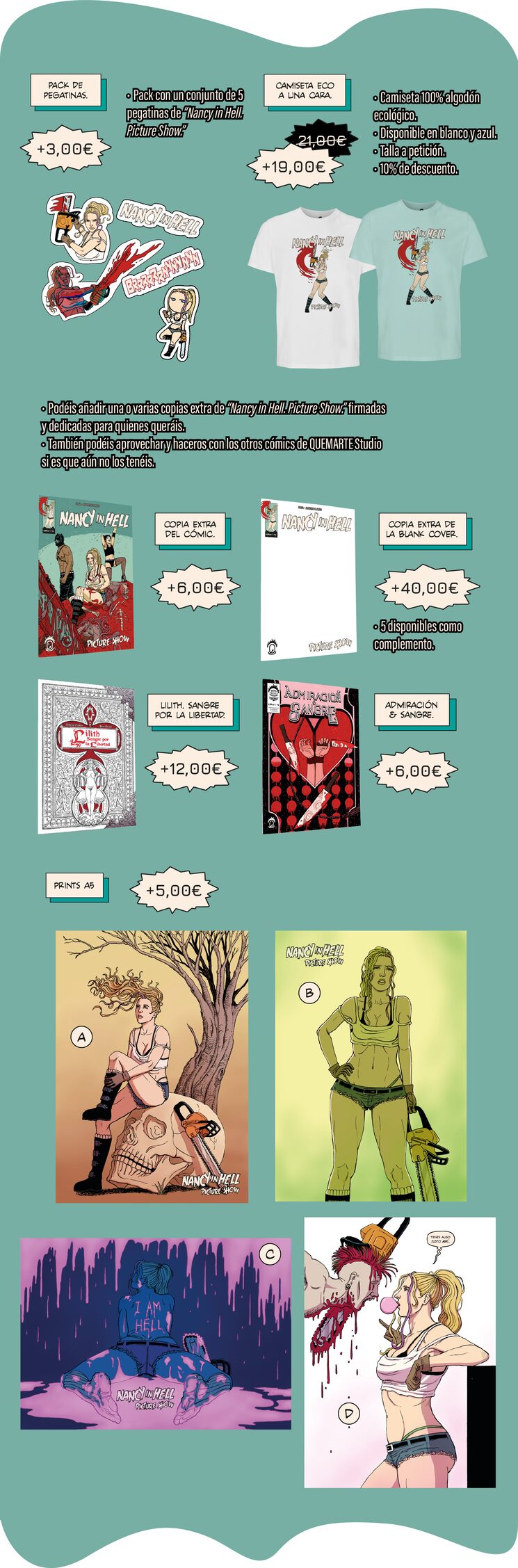 Los ejemplares restantes se distribuirán en librerías interesadas en la obra, se llevarán a ferias y se pondrán a la venta en mi tienda online QUEMARTE Shop con un PVP de 6,00€, IVA incluido.