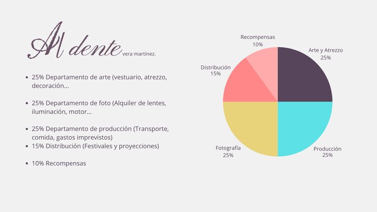 Destinaremos el 25% en arte y vestuario (atrezzo, props necesarios). Seguidamente, un 25% a la producción (gastos de catering, transporte, entre otras cosas). Para el departamento de fotografía un 25% (material técnico de luz y cámara).