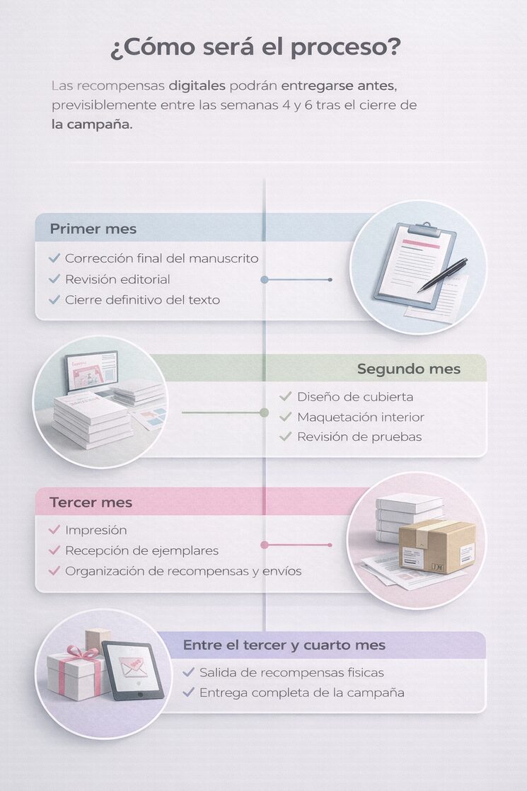 La recompensa principal será la edición física en preventa, pensada para quienes quieran recibir el libro antes de su circulación general. También habrá opción de ejemplar firmado, aparición en los agradecimientos, edición digital y algunos materiales complementarios preparados para esta campaña.