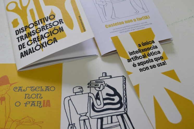 Por iso cremos conveniente materializar a loita e a pedagoxía máis aló dos contidos dixitais, os mails que mandamos, os post en RRSS ou as charlas que damos. Queremos sacalo á rúa, levalo posto ou poder dalo de man en man. Facer loita analóxica, tanxible, contra a IA xenerativa.